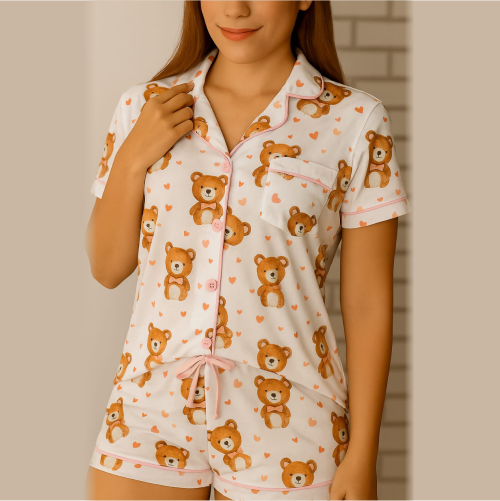 O Pijama de Verão Malha Suede Premium – Americano Urso Viés Rosa é uma peça de vestuário feita de malha suede, um tecido macio e confortável, ideal para noites mais quentes. Ele geralmente inclui um conjunto de blusa e short, proporcionando leveza e estilo para o verão.